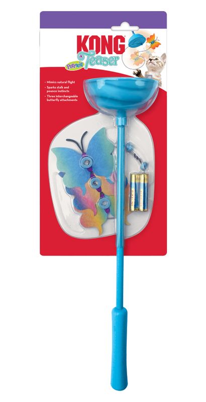 Purrsuit Teaser är en rolig kattleksak från det populära märket Kong Cat, ett spö med flera fladdrande härliga fjärilar som kommer att locka din kissemiss till lek och bus, höga hopp och stohej! Leksaken är batteridriven och kan användas både med och utan batteri-driften.