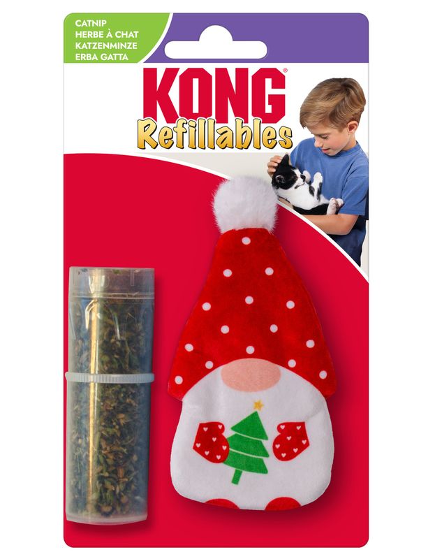 Som med alla förpackningar i Kongs "refillables"-serie så medföljer ett rör med Kongs egen starkakattmynta. Tomtenissen har en ficka på baksidan med kardborre, som man kan öppna och strö i lite kattmynta.