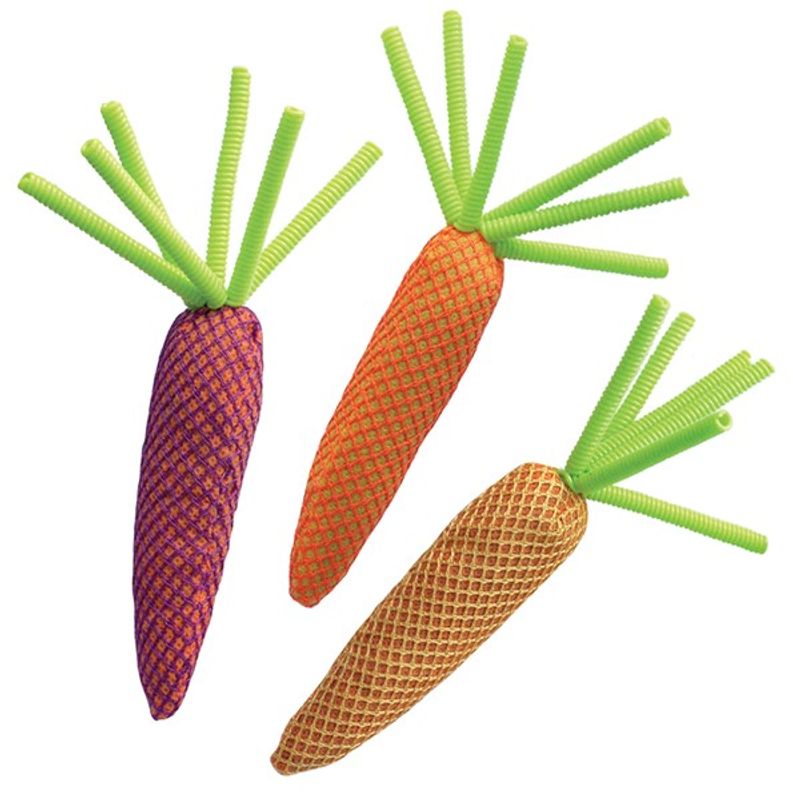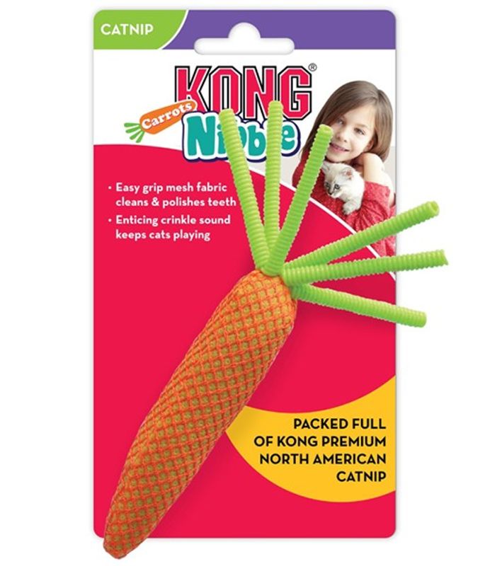 Nibble Carrots från märket Kong är en tålig kattleksak fylld med den starka kvalitets-kattmyntan från Kongs eget märke. Det slitstarka mesh-nätet uppmuntrar katten att tugga och bita på kattleksaken och bidrar till rengöring av kattens tänder. Prasselpapper inuti moroten locker din katt till lek och bus med sin Kong Carrot!