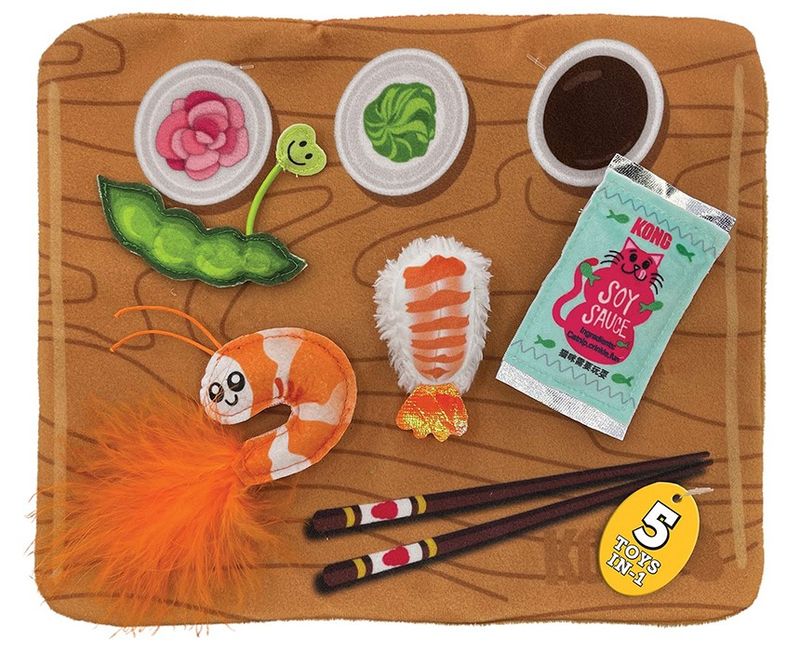 KONG Pull-A-Partz Sushi är "5-leksaker-i-1". Leksaken levererar en sushi-fest där din katt pillra loss leksakerna från "brickan" - den uppmuntrar till lek med både tassar och sinnen; doft och hörsel (med kattmynta och prassel). Att dra gröna edamamebönor, räkor och sojasås från kardborre är roligt, och Kongs Premium Nordamerikanska starka kattmynta peppar till mer lek och bus!