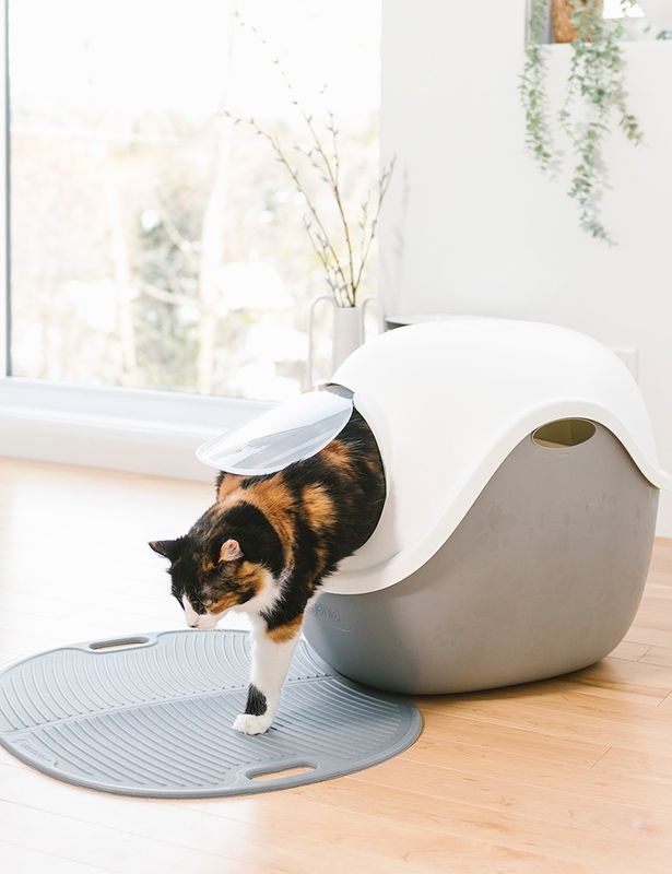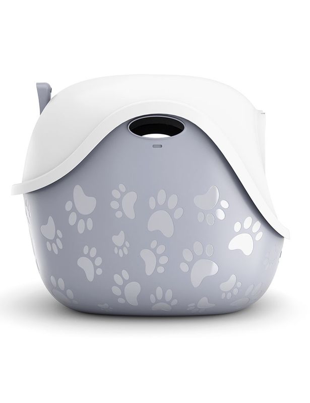 Huven har en svängdörr, som går att ta bort om katten föredrar det, samt en praktisk hållare på baksidan för kattsandsspaden. Hållaren för kattspaden är integrerad i huven, och eventuellt spill rinner direkt ner i kattlådan igen.