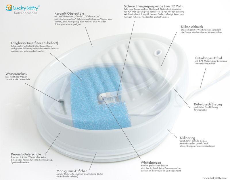 Keramikfontänen är även riktigt hygienisk - det är snabbt och lätt att rengöra den eftersom den är gjord av högbränt porslinsgods med en rundad design (därmed har den inga oåtkomliga skrymslen och vrår). Lucky-Kitty vattenfontän tål maskindisk och används helt utan filter.