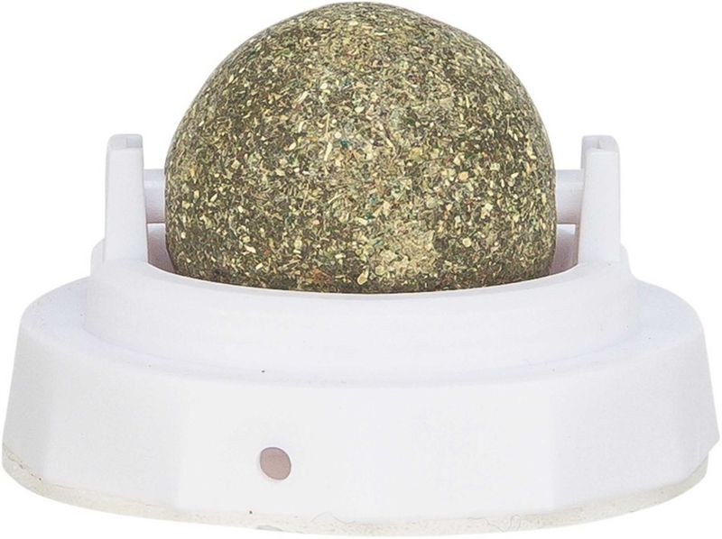 En hårdpressad boll av örten Matatabi som sitter fast i en plasthållare, denna hållare har självhäftande lim på baksidan så att du kan sätta upp den på en slät yta i hemmet. Därifrån kan din katt slicka på och gnugga sig mot bollen.