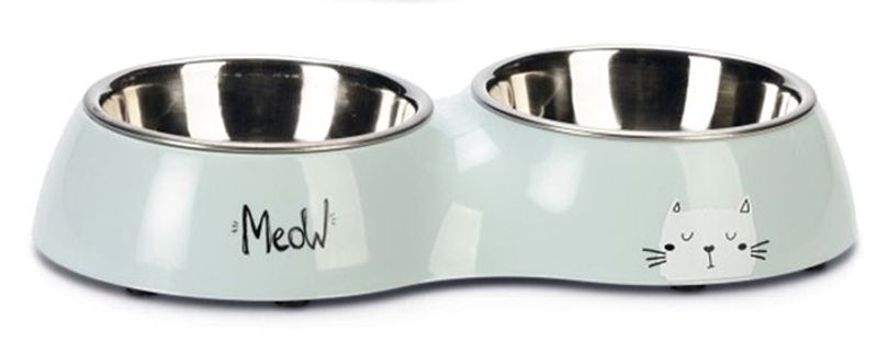 En fin ljust mintblå matbar för katter och kattungar. Matbaren har 2 st urtagbara innerskålar i rostfritt stål. Gulligt motiv med texten "Meow" på ena sidan och en vit katt på andra sidan.
