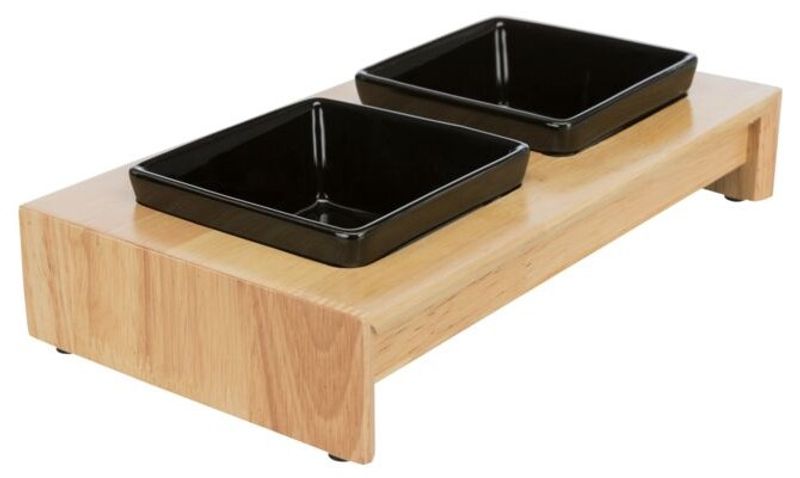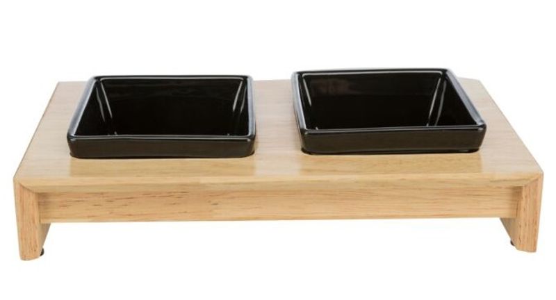 Fin matbar i trä till din katt som verkligen gör sig fin i hemmet. Två svarta keramikskålar som är löstagbara och tål maskindisk. Silikonfäste gör att skålarna sitter säkert på plats i den lackerade och robuste trähållaren och matbaren har även antislip undertill för att stå bra på golvet.
