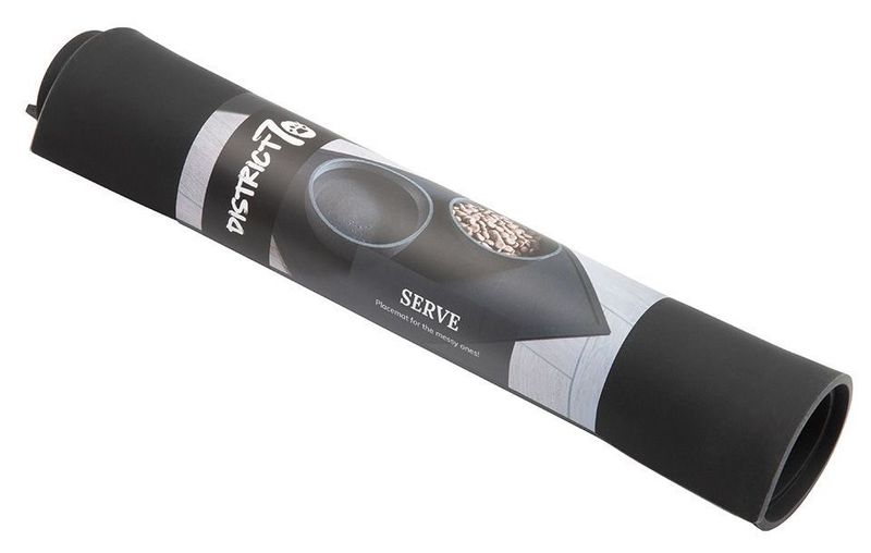 Snyggt matskålsunderlägg gjort av slitstarkt och livsmedelssäkrat silikon från märket District 70. Passar fint in i det moderna hemmet och håller golvet rent.