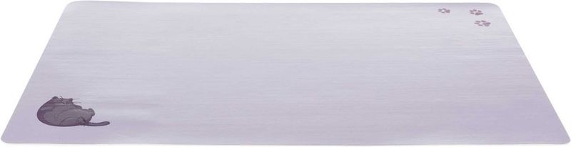 Matskålsunderlägg att ha under kattmatskålar, vattenskålar eller under vattenfontänen. Ett underläggg som skyddar golvet mot spill och kattmatsrester. Underlägg med gulligt kattmotiv i ena hörnet och tassavtryck i det andra hörnet.