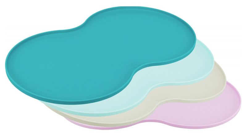 Färgglada underlägg med "midja" som passar matskålar upp till ca 20 cm. En låg kant hindrar det som spills från att rinna ut på golvet. Materialet är greppvänligt silikon och gör att skålarna står stadigt på underlägget.