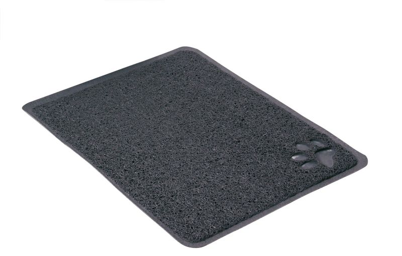 En grå mjuk matta att lägga utanför kattlådan som förhindrar spridning av kattsand och kattströ.