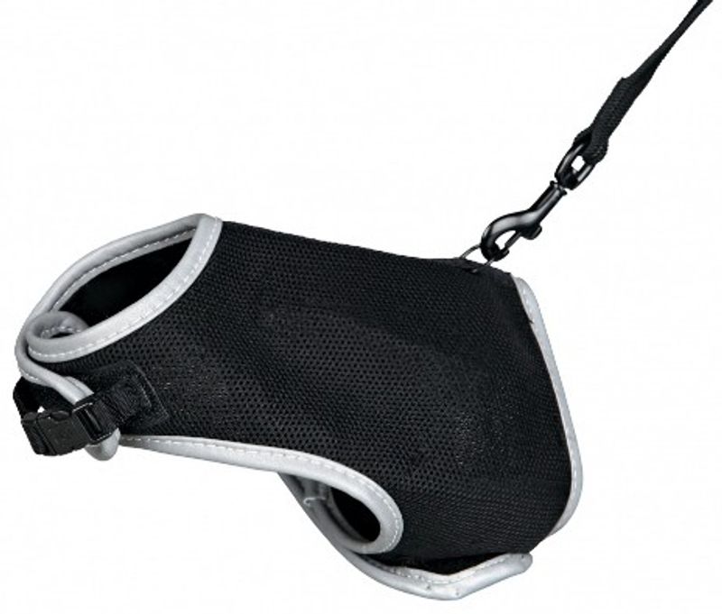 Grå eller svart kattsele tillverkad av slitstark polyester och nylon med extra mjukt foder som gör selen bekväm att bära för katten.