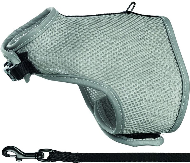Grå eller svart kattsele tillverkad av slitstark polyester och nylon med extra mjukt foder som gör selen bekväm att bära för katten.