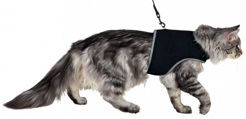 Grå eller svart kattsele tillverkad av slitstark polyester och nylon med extra mjukt foder som gör selen bekväm att bära för katten.