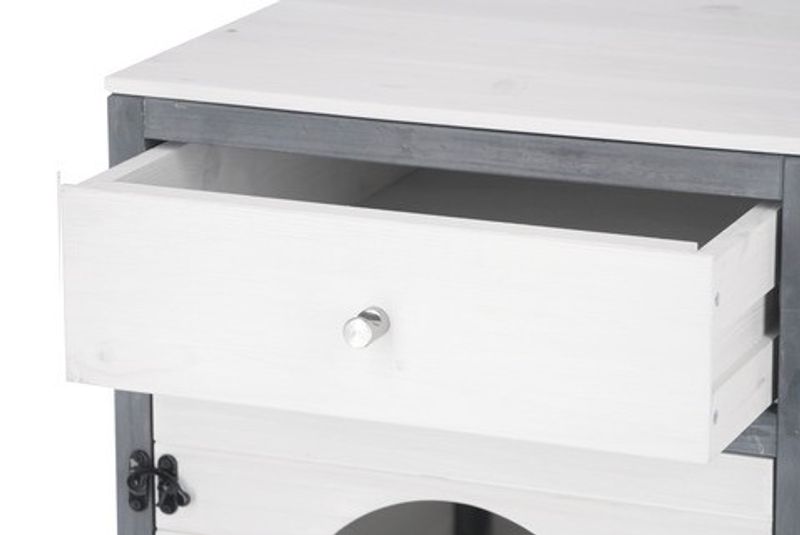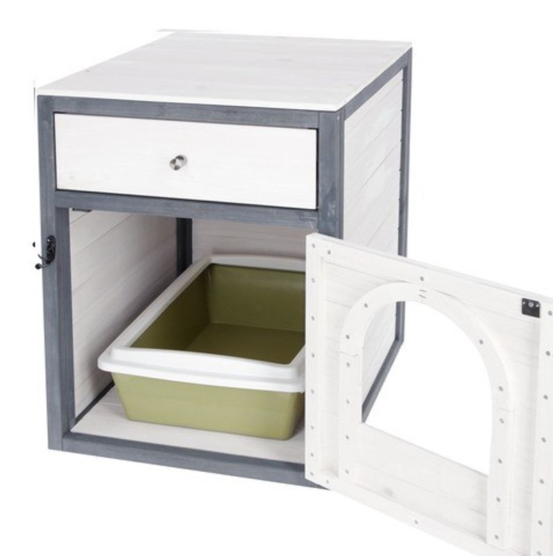 Möbel till kattlåda är vit och grå och har en praktisk låda ovantill, där du kan förvara till exempel spade och bajspåsar. Passar snyggt in i hemmet med sin fina design. Används möbeln för en kattlåda kommer du enkelt åt att rensa lådan genom att öppna dörren framtill.