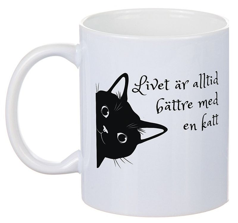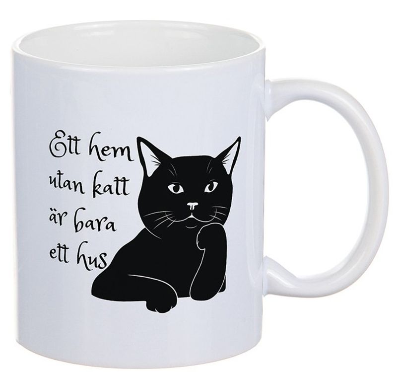 En fin mugg, vit färg och svart katt-motiv med texterna: "Ett hem utan katt är bara ett hus" och på andra sidan muggen: "Livet är alltid bättre med en katt"