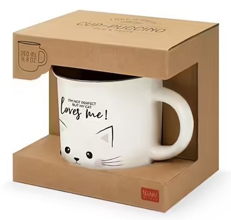 Supersöt mugg i porslin (new bone china) till kattälskaren! Muggen är vit med ett sött enkelt kattmotiv, och texten I'm not perfect but my cat loves me! Vi känner väl alla igen oss i det?