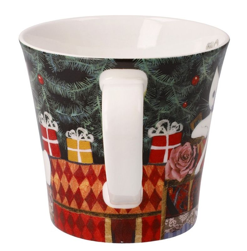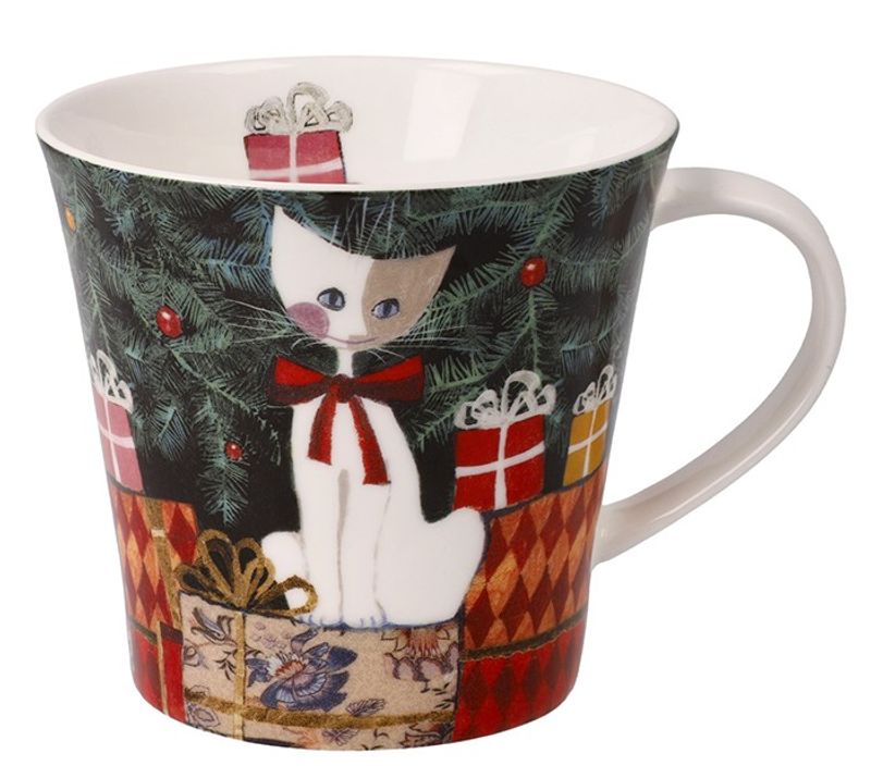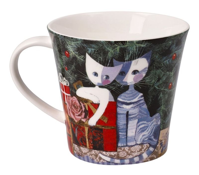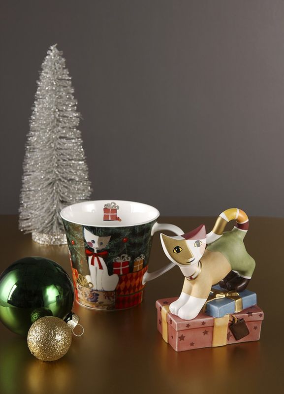 "Sorprese di Natale" är en så fin jul-mugg med motiv från konstnären Rosina Wachtmeister. Koppens motiv har en grön bakgrund av en julgran, med paket och katter framför.