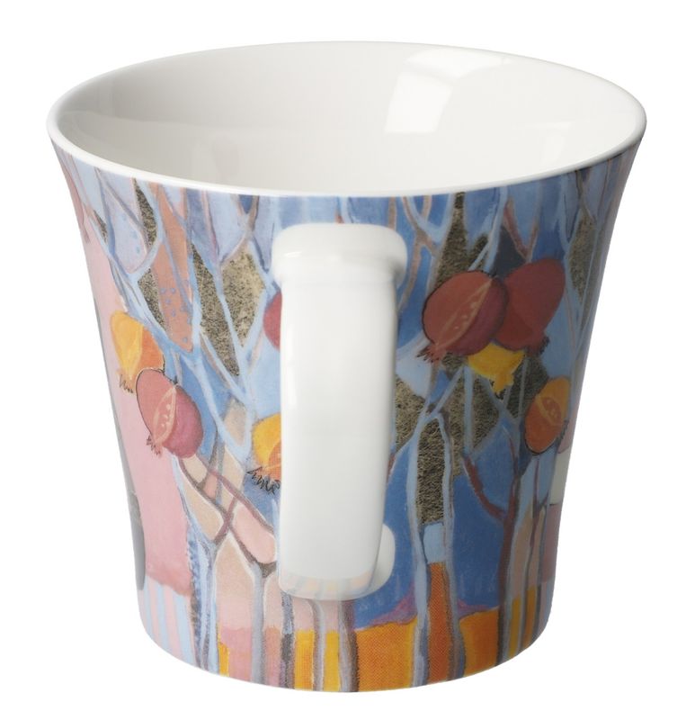 "Melograni in fiesta" är en fantastiskt fin mugg med motiv i rosa och ljusblå färgtoner. Översätter man muggens namn förstår man att motivet handlar om granatäpplen och fest.