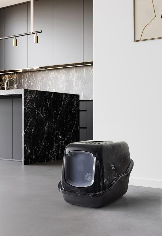 Nestor kattlåda med huv passar fint in i hemmet, på bild nr 3 ses hur luckan kan fällas upp vid rengöring av kattlådan så att man kommer åt bra att rengöra lådan med spade.