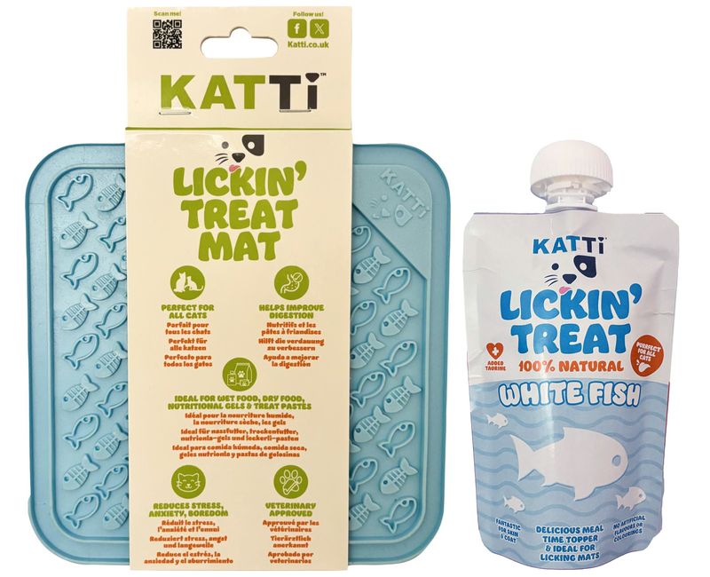 Värdepaket innehållande 1 st Katti fodermatta (i blå färg med fiskmönster) samt 1 st Katti Lickin' Treat med smak av vitfisk.