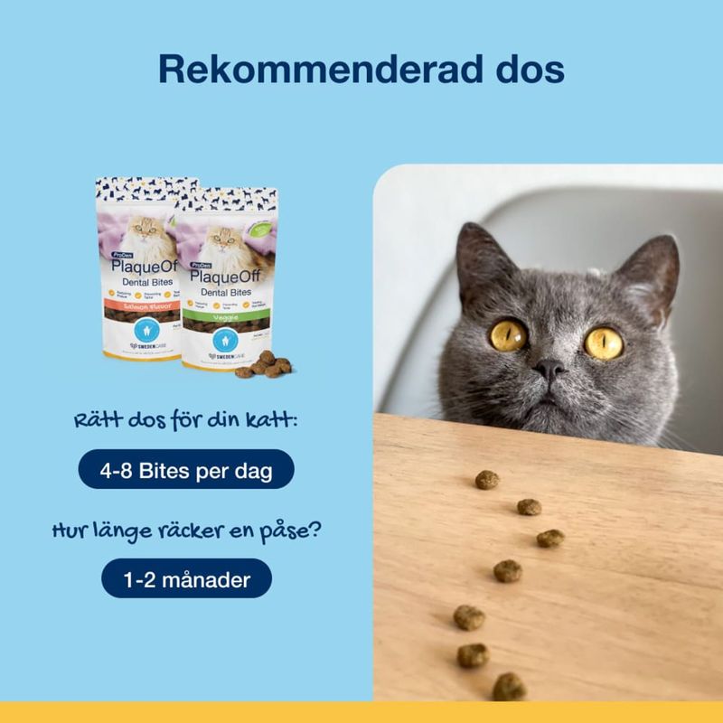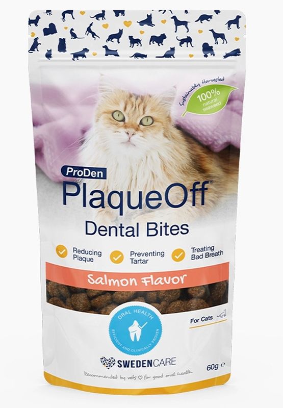 PlaqueOff dental bites kan du ge till din katt som en liten godisbit för att förebyggga tandsten, plack och dålig andedräkt.