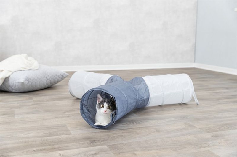 Prasseltunneln är lätt att fälla ihop till ett platt paket och stoppa undan när katten inte leker med den.