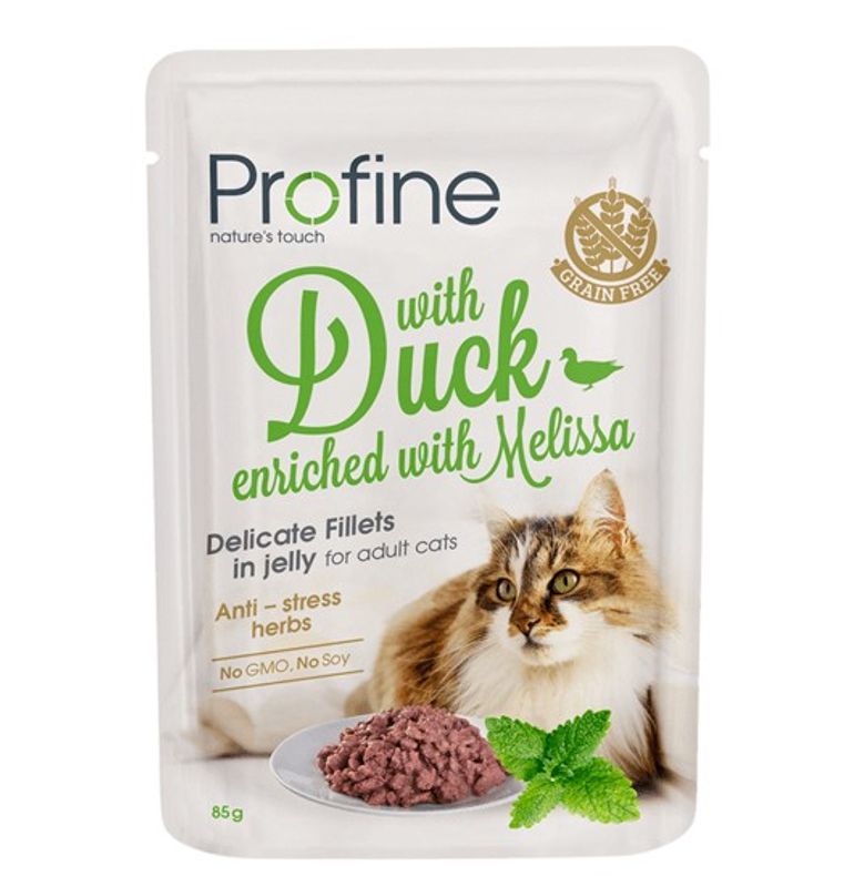 Profine våtfoder för katt är ett komplett helfoder för vuxna katter med smakliga filébitar i gelé, i en praktisk portionsförpackning om 85 gram. Fodret är ett superpremium-foder med en kötthalt om 82%. Denna påse innehåller anka och är berikad med örten citronmeliss, känd för sina stressdämpande egenskaper.