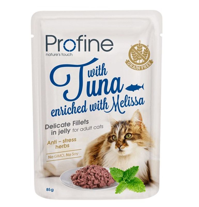 Profine våtfoder för katt är ett komplett helfoder för vuxna katter med smakliga filébitar i gelé, i en praktisk portionsförpackning om 85 gram. Fodret är ett superpremium-foder med en kötthalt om 82%. Denna påse innehåller tonfisk och är berikad med örten citronmeliss, känd för sina stressdämpande egenskaper.