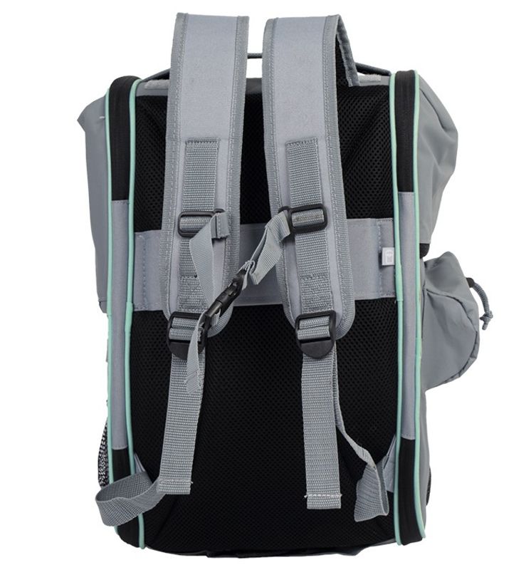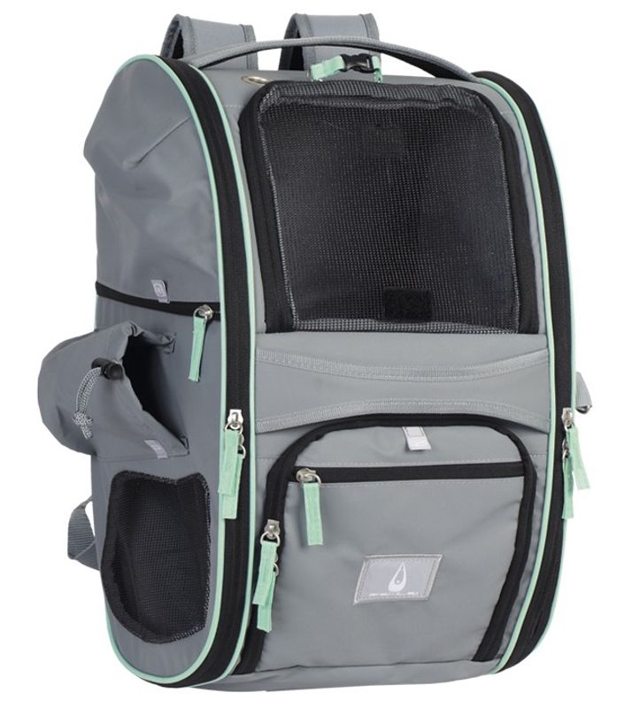 De många mesh-insatserna tillåter en bra luftcirkulation i väskan, några nätinsatser kan öppnas och stängas. "Nomad" är även utrustad med 5 fickor där man kan förvara lite godis, ett koppel eller annat smått och gott. Ett vattentätt skydd medföljer till denna väska (se produktbild nr 2 och 7).