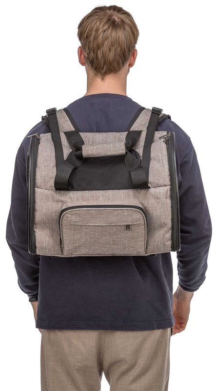 Funktionell ryggsäck tillverkad i kvalitetsnylon med justerbara axelremmar och midjerem. Väskan kan öppnas framtill och på ena sidan för katten och har ett kort koppel fäst på väskans insida så att katten inte kan hoppa ut om man vill ha väskan lite öppen.