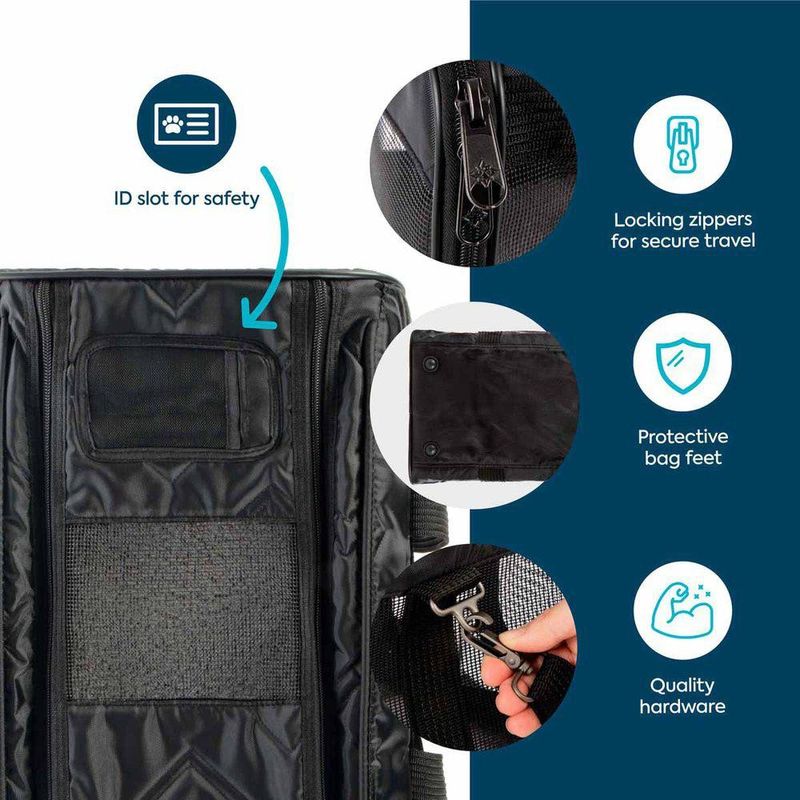 Perfekt för resor med flyg eller bil, för en utflykt eller bara till veterinären. Ram av patenterad fjädertråd gör att väskans front kan tryckas ned för att anpassas till utrymmet under flygplansstolen.