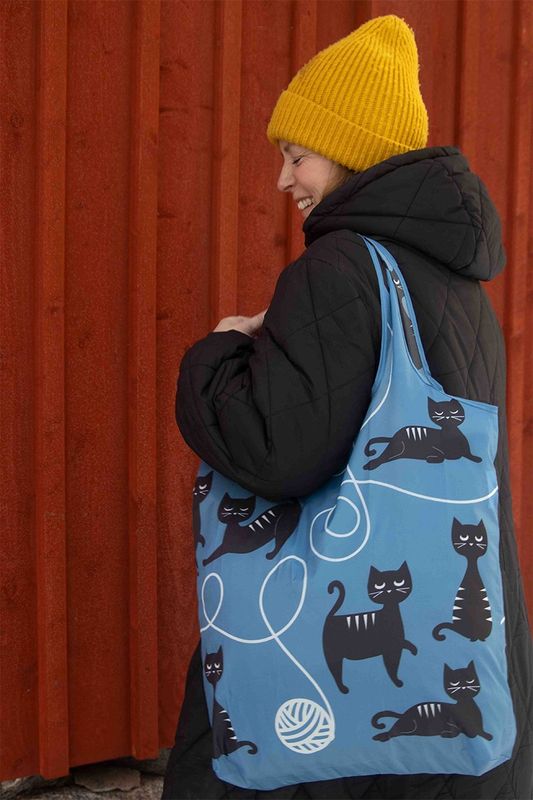 Shoppingpåse från märket Pluto Produkter, blå bakrungsfärg med fint mönster av svarta kattsiluetter.
