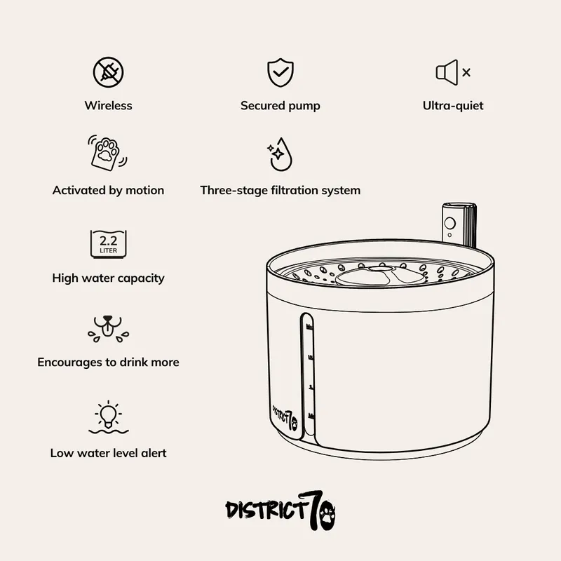 Elegant, smart och helt trådlös, District 70 Flow är den perfekta vattenfontänen för katter och små hundar och ger dem ett friskt och fräsht vatten dygnet runt. Fontänen kombinerar snygg design med tyst drift, rörelsesensor och ett avancerat 3-stegs filtersystem som håller vattnet rent, fräscht och inbjudande.