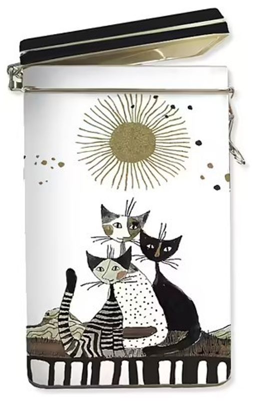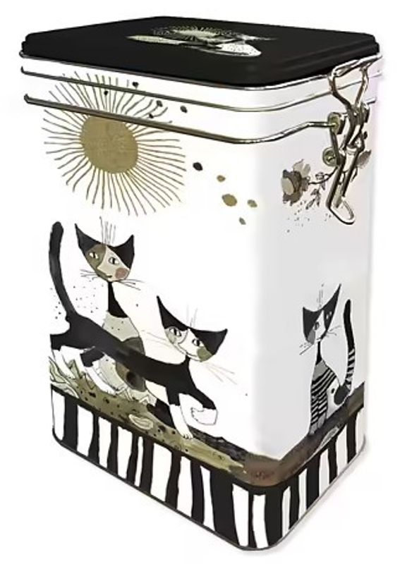 Stilren förvaringsburk från Rosina Wachtmeister i hennes serie "sepia". Burken är i metall och har ett uppfällbart lock med spänne för förslutning.