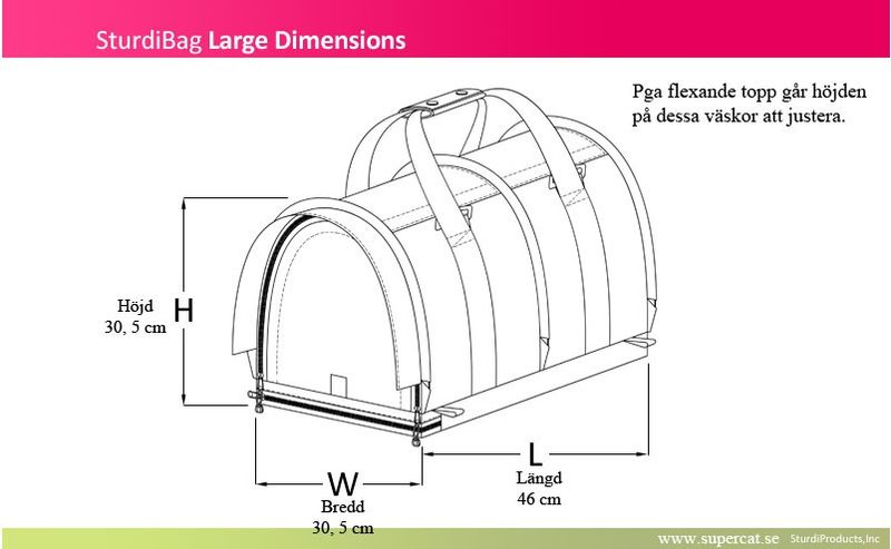 SturdiBagen är en transportväska med patenterade flexibla bågar som gör att väskan flexar på höjden och låter djuret få mesta möjliga plats under t ex en flygstol.