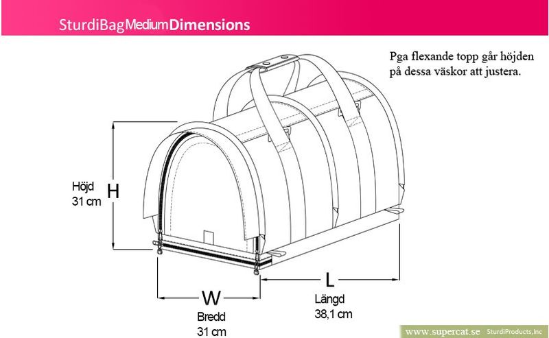 SturdiBagen är en transportväska med patenterade flexibla bågar som gör att väskan flexar på höjden och låter djuret få mesta möjliga plats under t ex en flygstol. I botten på väsken finns en hård skumplatta vilket gör att väskan håller formen när man bär den på axeln och katterna känner sig trygga.