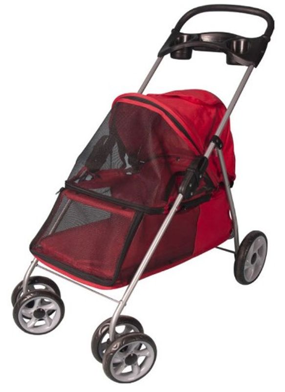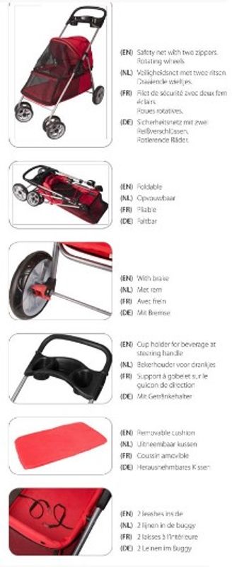 Lätt att fälla ihop och bromsbara hjul. Tvättbar dyna i botten och 2 korta koppel att fästa hund i.