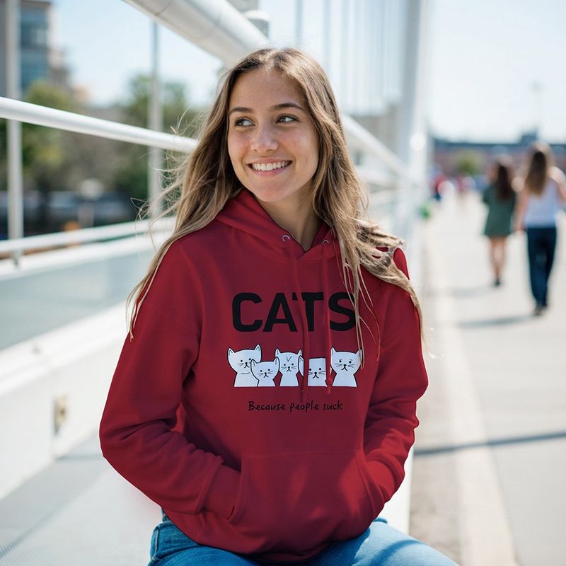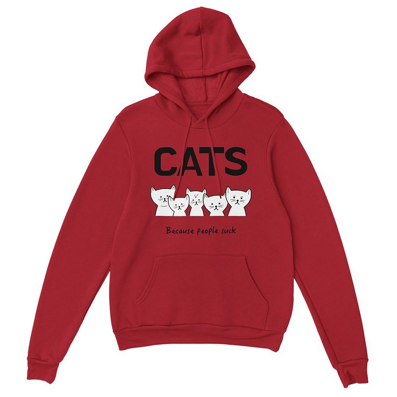 Tryckt med texten: Cats [bild katter] because people suck. Trycket sitter på framsidan, medan baksidan är enfärgad.