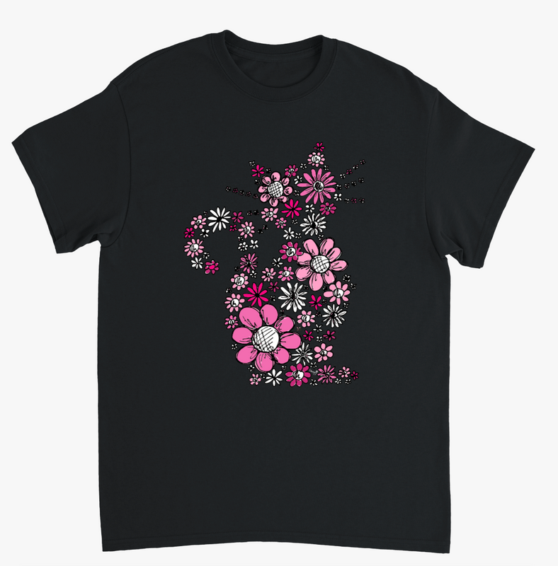 Äntligen finns vår favoritkatt, Blommiga Katten som t-shirt! Blommiga katten är en katt uppbyggt av rosa blommor, två av våra favoritsaker.