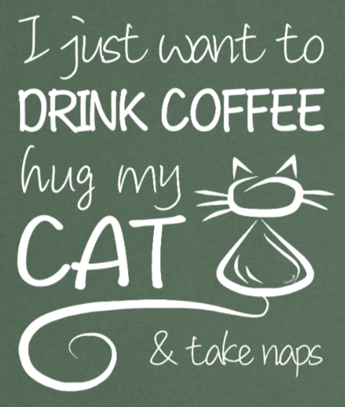 Äntligen tillbaka! Den snygga t-shirten med trycket "I just want to drink coffee, hug my cat & take naps", är nu tillbaka i en ny grön skön färg. Den perfekta presenten till dig själv eller till någon av dina kattvänner! T-shirten har tryck på framsidan och är helt ren på baksidan.