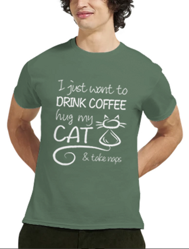 Äntligen tillbaka! Den snygga t-shirten med trycket "I just want to drink coffee, hug my cat & take naps", är nu tillbaka i en ny grön skön färg. Den perfekta presenten till dig själv eller till någon av dina kattvänner! T-shirten har tryck på framsidan och är helt ren på baksidan.