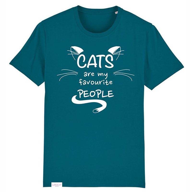En t-shirt i den trendiga färgen petrol, från vår alldeles egna lilla kollektion med tröjor. T-shirtar tryckta med det fina kattmotivet som Jenni har ritat och designat; "Cats are my favourite people". Vi har valt ut en unisex t-shirt av 100% ekologisk, certifierad och rättvisemärkt bomull.