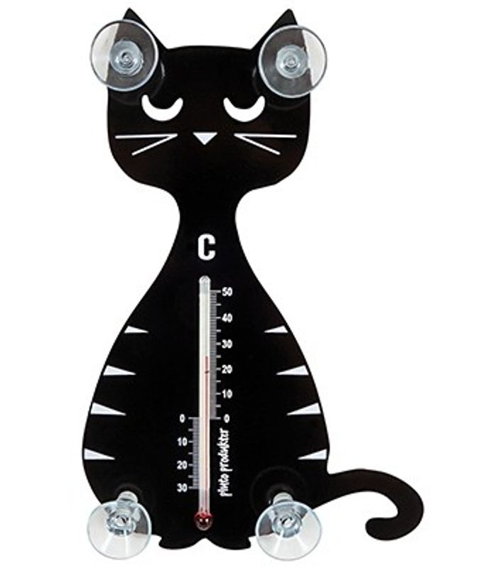 Härlig kattig termometer från märket Pluto Produkter. Den fästs på fönsterrutan med sugpropparna som sitter på tassar & öron och visar dig temperaturen utanför fönstret.