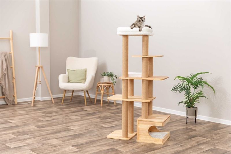 Thiago klösmöbel i naturträ - en stilren favorit med plats för både kattlurar, bus och klös!