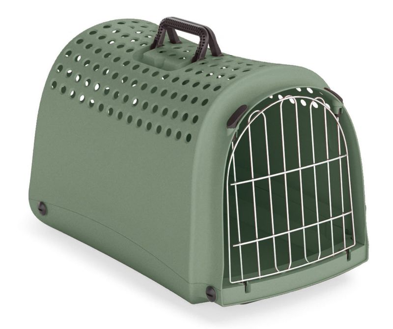 En funktionell transportbur i grön färg, tillverkad av återvunnen plast i serien "2:nd Life". Transportbur som man öppnar framtill med metallgaller, transportburen är lite högre i modellen än en standardtransportbur och riktigt snygg. Håller även bra för lite tyngre katter.