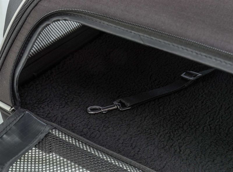 Väskan har ett kort koppel fäst på väskans insida så att katten inte kan hoppa ut om man vill ha väskan lite öppen och du har en sele på din katt. Tänk dock på aldrig lämna din katt utan tillsyn inuti väskan med kopplet fastsatt.