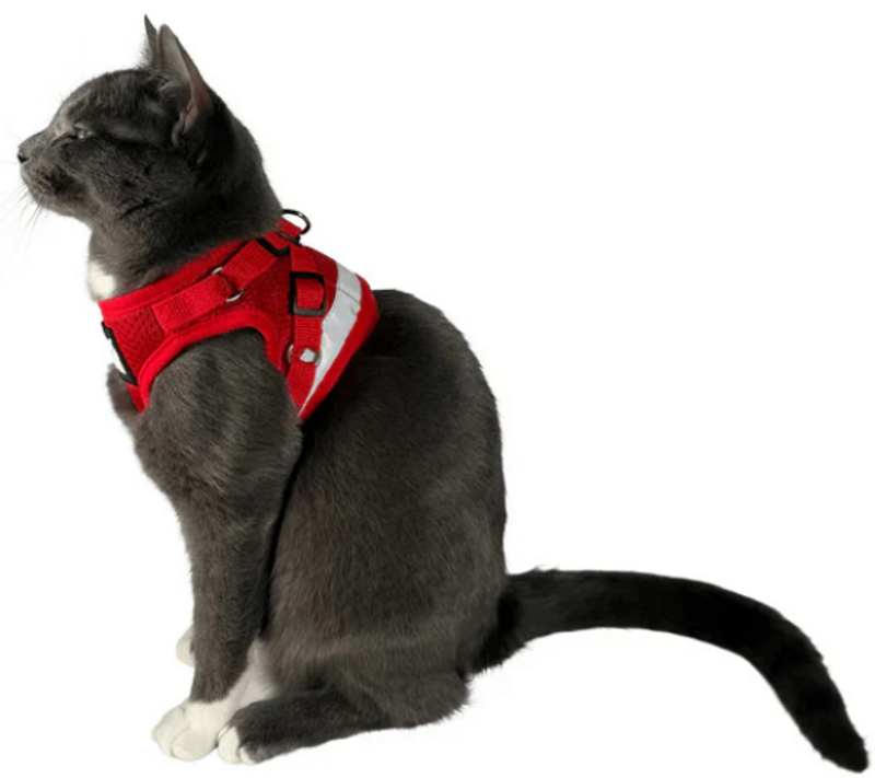 Selen har reflexband runtom i nederkant, som gör att katten synlig ute under mörka kvällar.