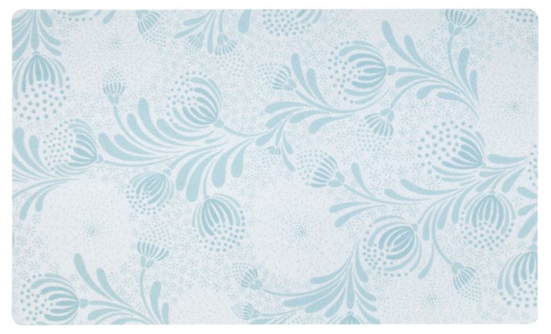 Ett absorberande underlägg från märket Drymate med ljusblå och vit färgskala, motivet påminner om en fin tapet med blommigt mönster. Underlägget passar bra till matskålar och speciellt bra är det att ha under vattenskålar och vattenfontäner.