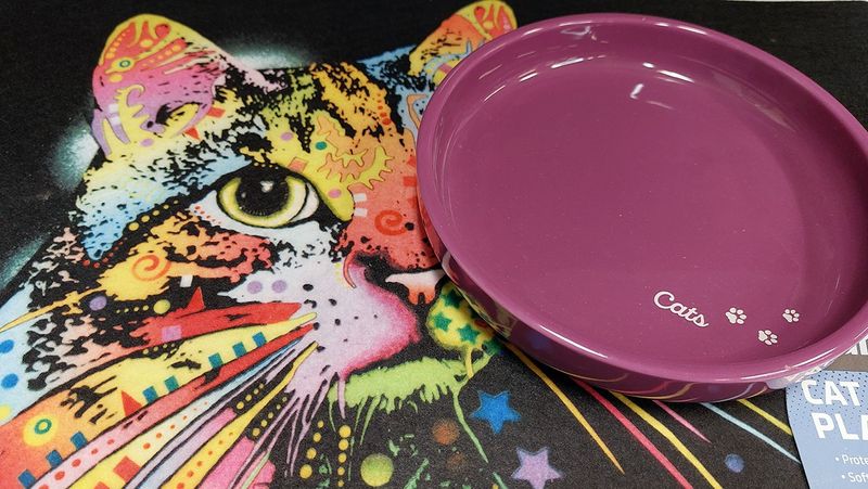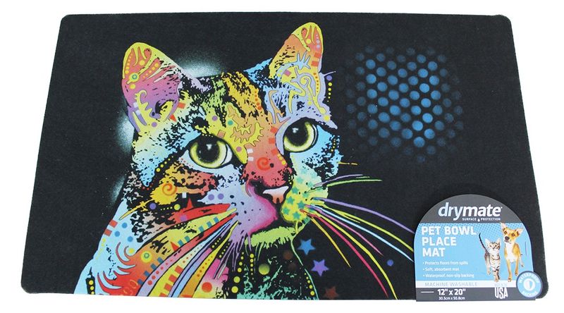Ett absorberande underlägg från märket Drymate med mörk bottenfärg och superfint flerfärgat kattmotiv. Underlägget passar bra till matskålar och speciellt bra är det att ha under vattenskålar och vattenfontäner.