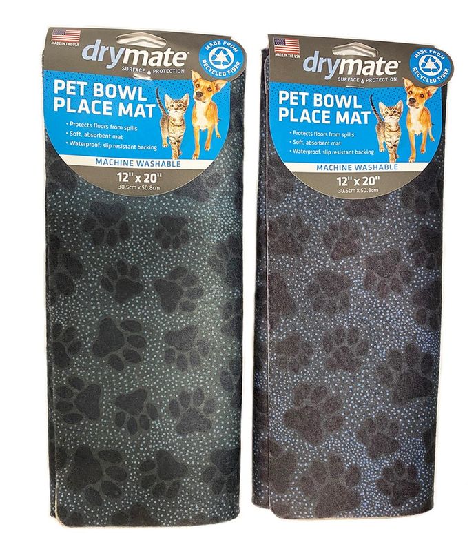 Ett absorberande underlägg från märket Drymate med grå-svart färgskala och motiv av flera tassar. Underlägget passar bra till matskålar och speciellt bra är det att ha under vattenskålar och vattenfontäner.