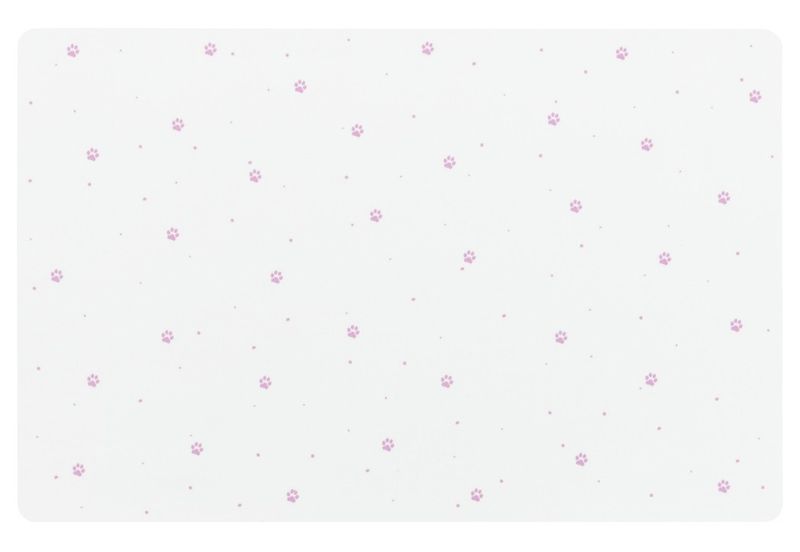 Fint underlägg till din kattmatskål eller vattenskål, vitt underlägg med motiv av rosa tassmönster.